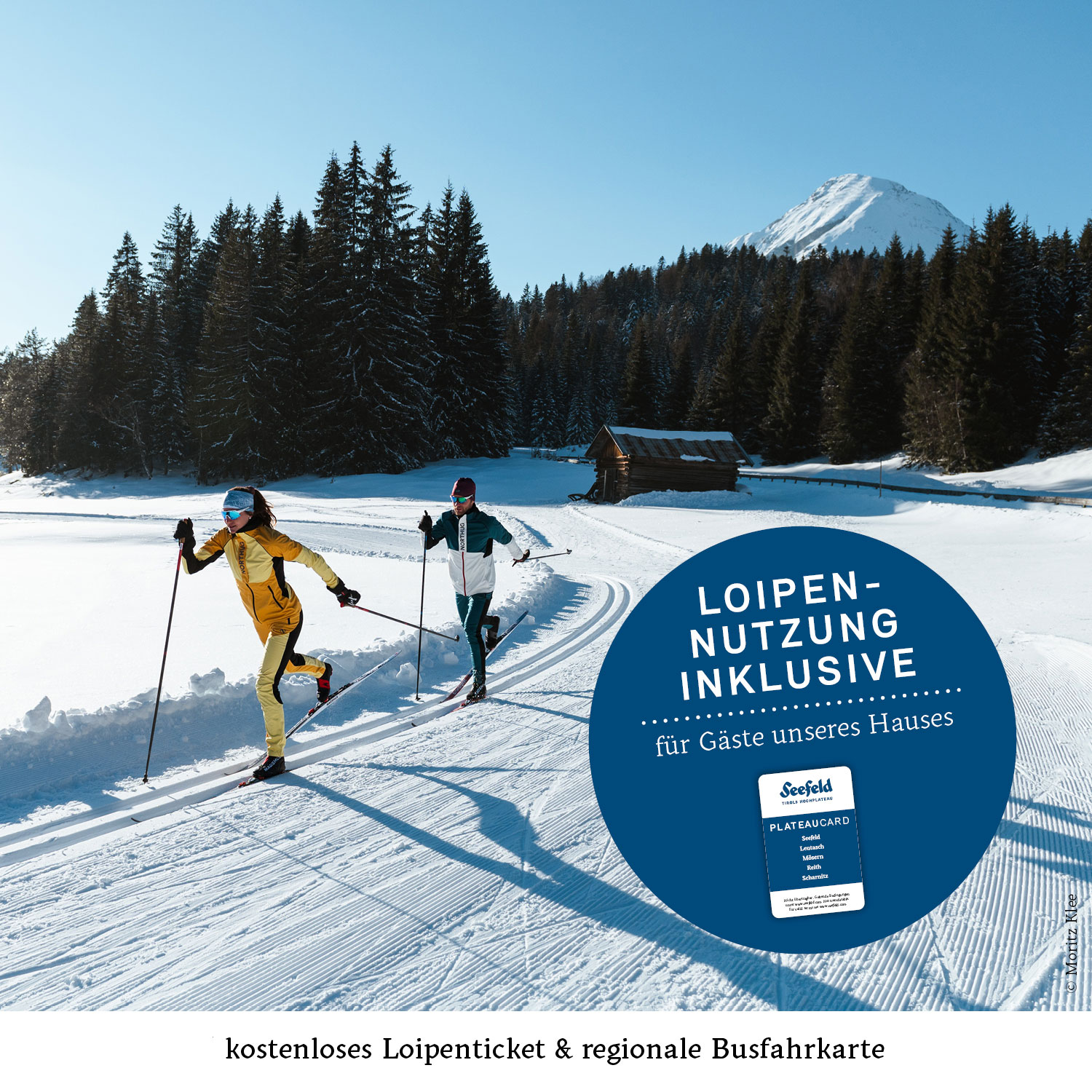 Im Sommer entdeckt der Wanderer auf rund 450 km Wanderwegen versteckte Winkel und gemütliche Almen, von denen noch 20 bewirtschaftet sind und zum Verweilen einladen. Die im Verbund mit Seefeld 279 km täglich gespurten Loipen (Skating und Klassisch) haben unsere Region mit Recht den Titel "größtes Langlaufzentrum der Alpen" eingebracht. Aber auch dem Wanderer bieten wir 95 km geräumte und gestreute Winterwanderwege zu den schönsten und sonnigsten "Ecken" der Leutasch an. Eine Bushaltestelle befindet sich in unmittelbarer Nähe zu unserem Haus und Restaurants, sowie ein Lebensmittelgeschäft sind binnen 5-10 Gehminuten erreichbar.